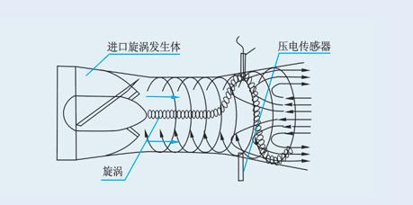 當(dāng)沿著軸向流動的流體進(jìn)入流量傳感器入口時(shí),旋渦發(fā)生體強(qiáng)迫流體進(jìn)行旋轉(zhuǎn)運(yùn)動,于是在旋渦發(fā)生體中心產(chǎn)生旋渦流,旋渦流在文丘利管中旋進(jìn),到達(dá)收縮段突然節(jié)流使旋渦流加速,當(dāng)旋渦流進(jìn)入擴(kuò)散段,因回流作用強(qiáng)迫進(jìn)行旋進(jìn)式二次旋轉(zhuǎn)。此時(shí)旋渦流的旋轉(zhuǎn)頻率與介質(zhì)流速成正比,并為線性。兩個(gè)壓電傳感器檢測的微弱電荷信號經(jīng)前置放大器差動放大、濾波、整形后變成兩路頻率與流速成正比的脈沖信號,同時(shí)處理電路對兩路的脈沖信號進(jìn)行相位比較和判別,剔除干擾信號,而對正常的流量信號進(jìn)行計(jì)數(shù)處理。