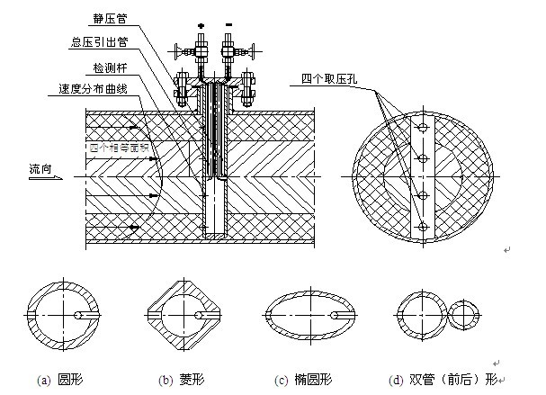 1、均速管流量計由檢測桿、取壓口和導桿組成。均速管的檢測管截面形狀分為圓形、菱形、橢圓形等多種結(jié)構(gòu)。如圖所示。