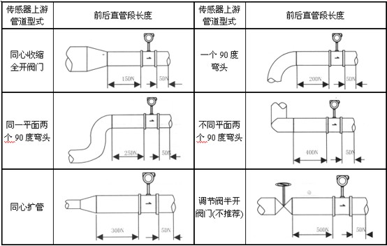 3、蒸汽流量計的上游側(cè)和下游側(cè)應(yīng)留有較長的直管段,要求的上下游直管段長度隨管道狀況不同而異。渦街流量計的上游應(yīng)盡量避免安裝調(diào)節(jié)閥或半開閥門,應(yīng)將調(diào)節(jié)閥或半開閥門安裝在流量計下游5D以后。