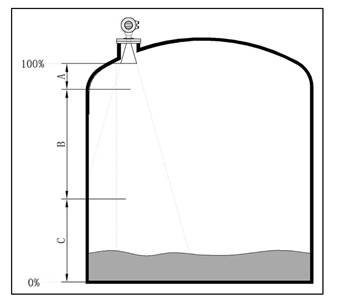 若介質(zhì)為低介電常數(shù)當其處于低液位時,罐低可見,此時為保證測量精度,建議將零點定在低高度為C 的位置。